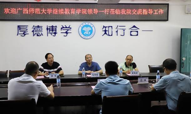 7月7日,广西师范大学继续教育学院韦学韬院长一行3人到我院进行成人高等教育工作交流,并检查了教学点各方面工作。