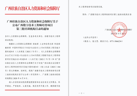 近日,广西壮族自治区人力资源和社会保障厅公布数字技术工程师培育项目第三批培训机构目录,由继续教育学院、计算机科学与工程学院协同申报的数据安全工程技术人员项目成功入选。
