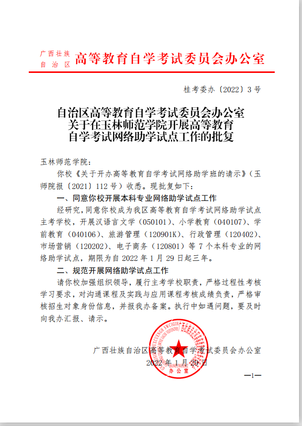 自治区高等教育自学考试委员会办公室关于在玉林师范学院开展高等教育自学考试网络助学试点工作的批复